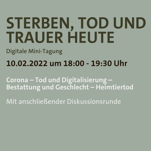 Vier kurze Vorträge befassen sich mit den Themen Corona, Digitalisierung, dem Verhältnis von Tod und Geschlecht sowie dem Heimtiertod.