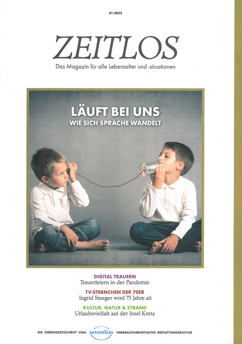 In der aktuellen Ausgabe der Aeternitas-Vereinszeitschrift "Zeitlos" berichten wir unter dem Titel "Läuft bei uns" über den Wandel unserer Sprache. Außerdem stellt die neue "Zeitlos" unter anderem digitale Trauerfeiern und die Urlaubsinsel Kreta vor.